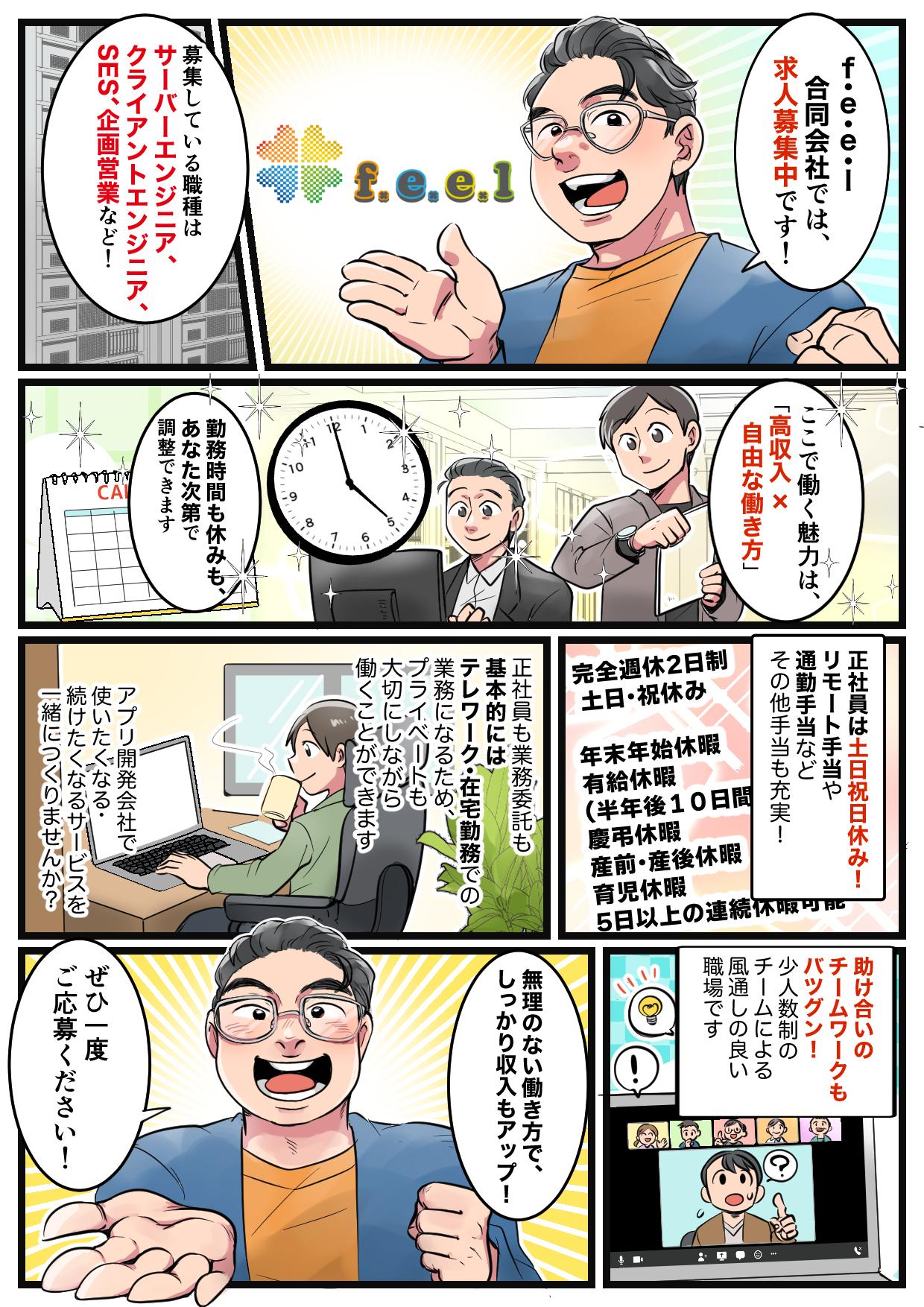 f.e.e.l合同会社は、Webやスマートフォン向けの業務アプリに加え、ゲームアプリ開発やゲーミフィケーション要素を取り入れたソリューション提案まで手がける開発会社です。クライアントの課題を丁寧にヒアリングし、業務効率化やDX推進につながるシステムを、企画・設計から開発・運用まで一貫して提供しています。アジャイル開発とUI/UX設計に力を入れ、「使いやすく、結果が出るプロダクト」をつくり続けている会社です。 そんな私たちと一緒に、新しい価値を生み出していく仲間を募集しています。ご応募を心よりお待ちしています。